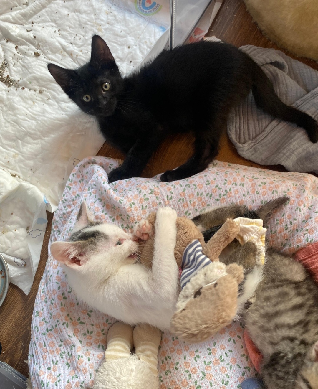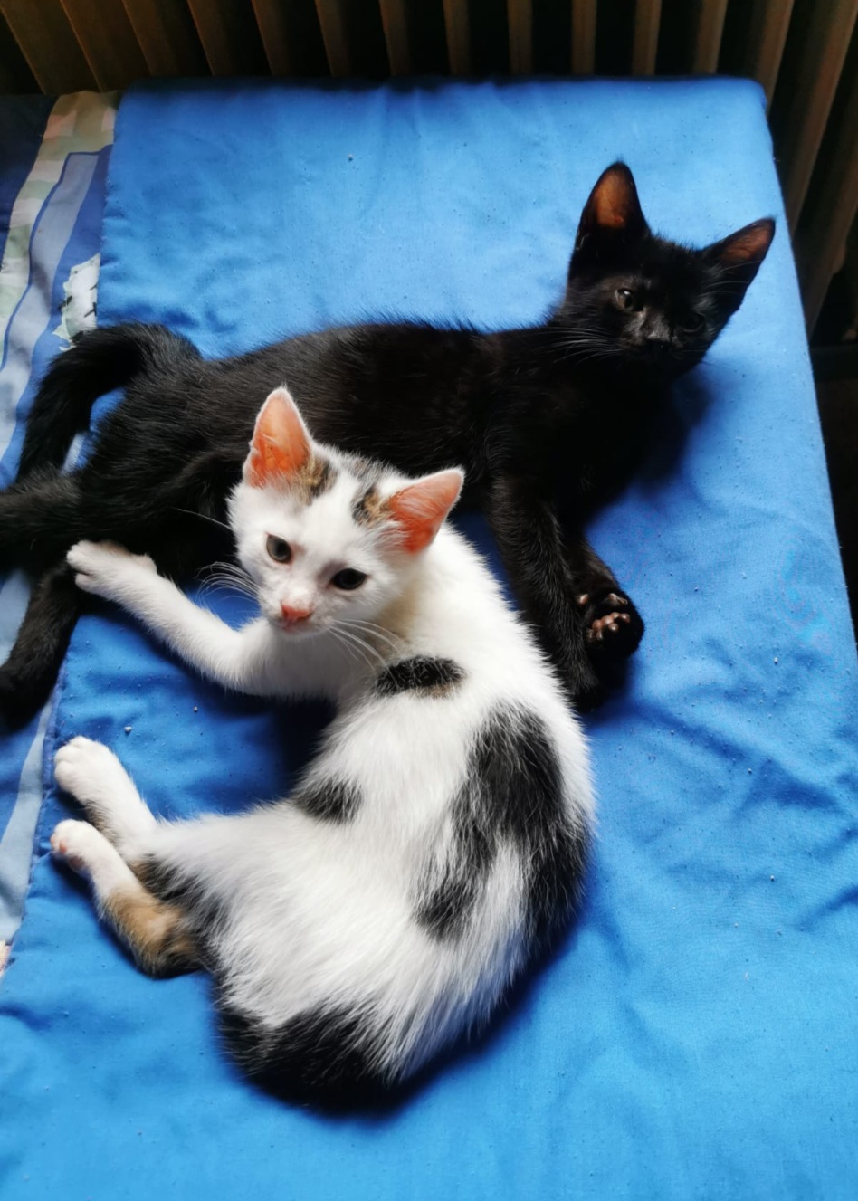Heute sind sie zu zwei lebensfrohen, verspielten und verschmusten Katzenkindern herangewachsen, die ihre erste Impfung bereits bekommen haben.